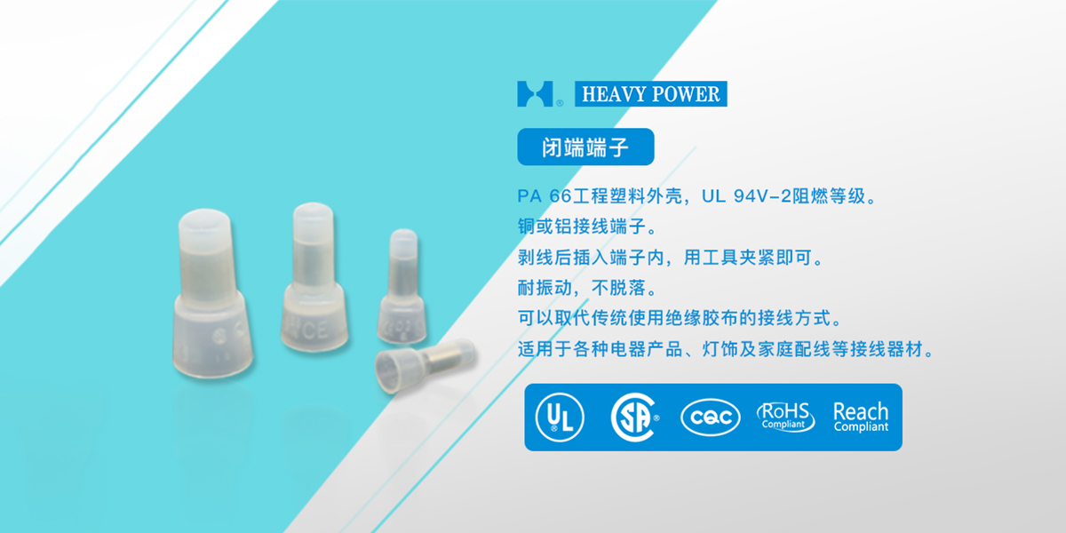 一、閉端端子特點(diǎn)1、PA 66工程塑料外殼,UL 94V-2阻燃等級。2.銅或鋁接線端子。3.剝線后插入端子內(nèi),用工具夾緊即可。4.耐振動(dòng),不脫落。5.可以取代傳統(tǒng)使用絕緣膠布的接線方式。6.適用于各種電器產(chǎn)品、燈飾及家庭配線等接線器材。