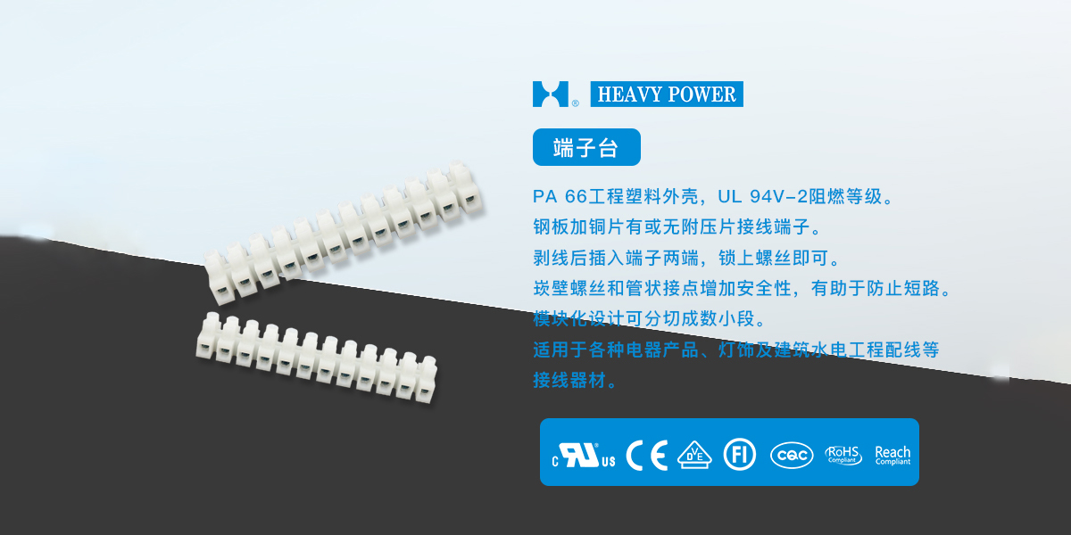 一、端子臺(tái)產(chǎn)品特點(diǎn)1.PA 66工程塑料外殼,UL 94V-2阻燃等級。2.鋼板加銅片有或無附壓片接線端子。3.剝線后插入端子兩端,鎖上螺絲即可。4.嵌壁螺絲和管狀接點(diǎn)增加安全性,有助于防止短路。5.模塊化設(shè)計(jì)可分切成數(shù)小段。6.適用于各種電器產(chǎn)品、燈飾及建筑水電工程配線等接線器...